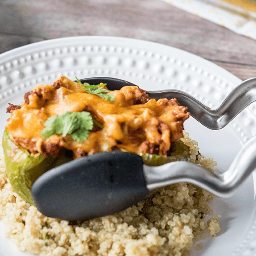 The ultimate all-in-one flipping, mixing and serving utensil is here with Dreamfarm’s 9″ Clongs Silicone Tongs in Black. These unique tongs stand out from the crowd and sit up on your counter with a C-shaped bend in the handle that keeps the tips pointed up to prevent messes. To lock and unlock, just click the bottom of the tongs the way you would click a retractable pen. The button is easy enough to push with one hand, or just click it on the counter when your hands are full. The wide silicone tips have a waffle head design for gripping any size food. Plus, they’re non-stick safe, dishwasher-safe and heat-resistant up to 500°F. With the strength of the stainless steel handle, this heavy duty utensil can turn the thickest T-bones, cheesy enchiladas and more with minimal effort.