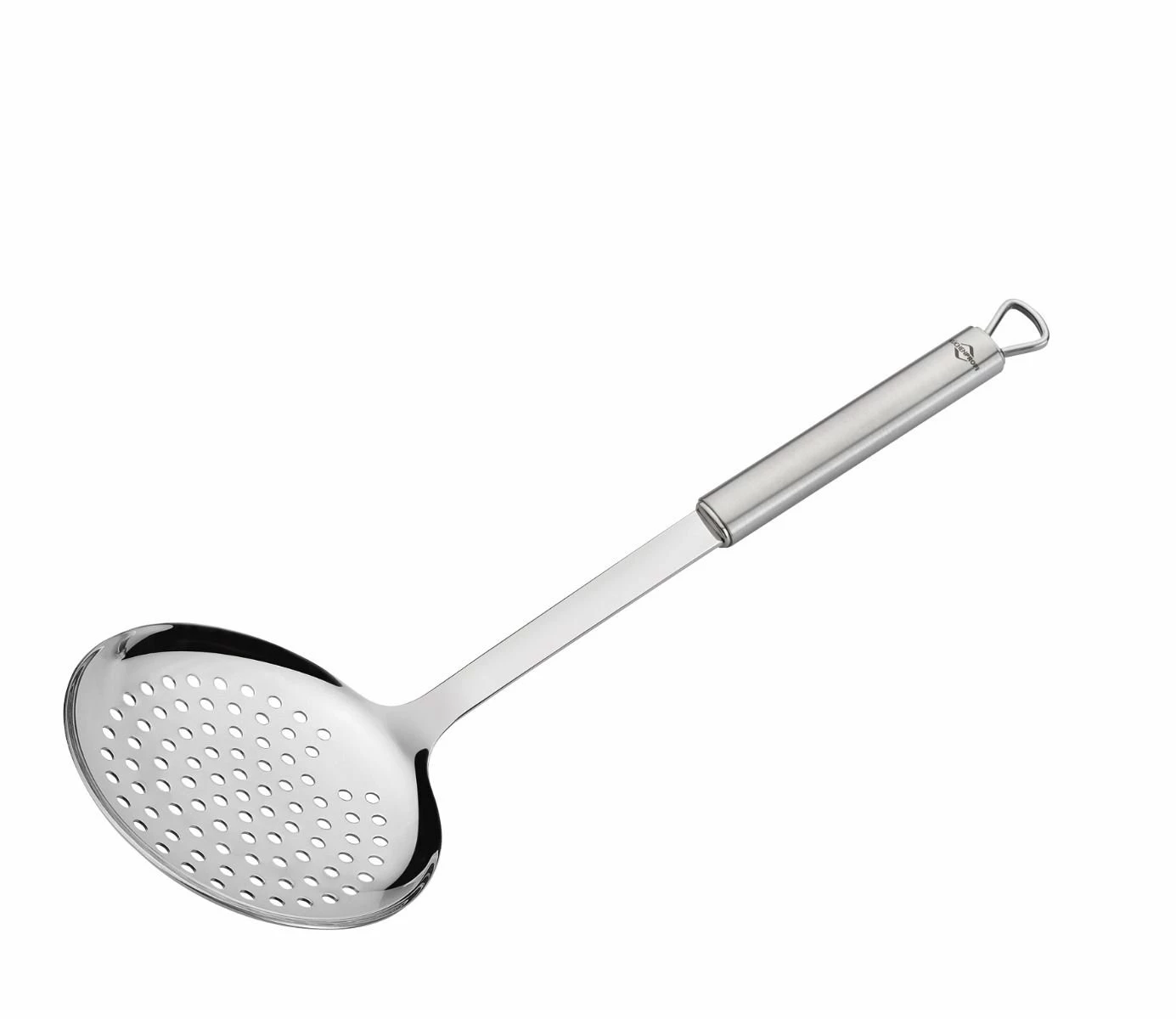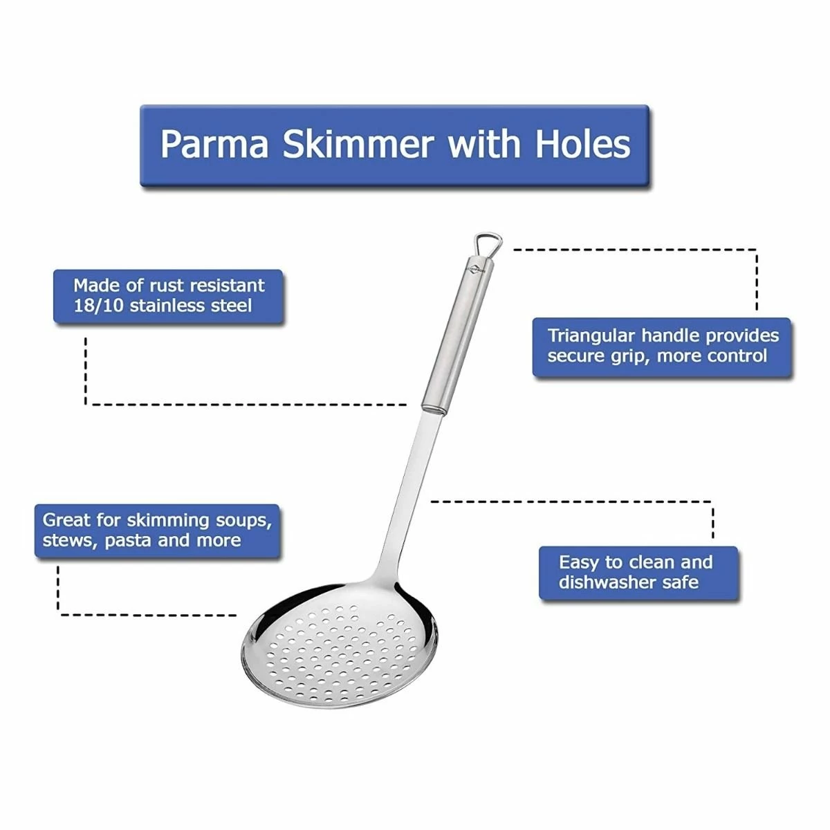 Clarify butter or skim excess fat from your soup with the Frieling Parma Skimmer with Holes (14″)! This skimmer is made from rust-resistant stainless steel and can skim or scoop foods and fats from broth or oil. The ergonomic triangular handle provides comfort and control, while the ring at the end offers the option of convenient hanging storage. This skimmer is dishwasher-safe, making cleanup a breeze! Whether you’re skimming the cream from your milk or chunks from your gravy, the Frieling Parma Skimmer with Holes (14″) is up to the task!Â