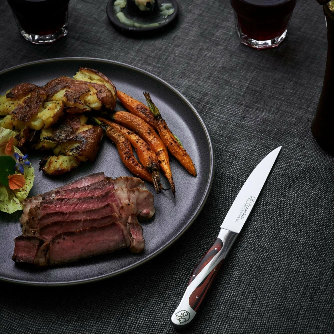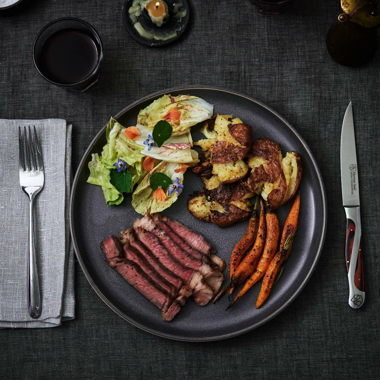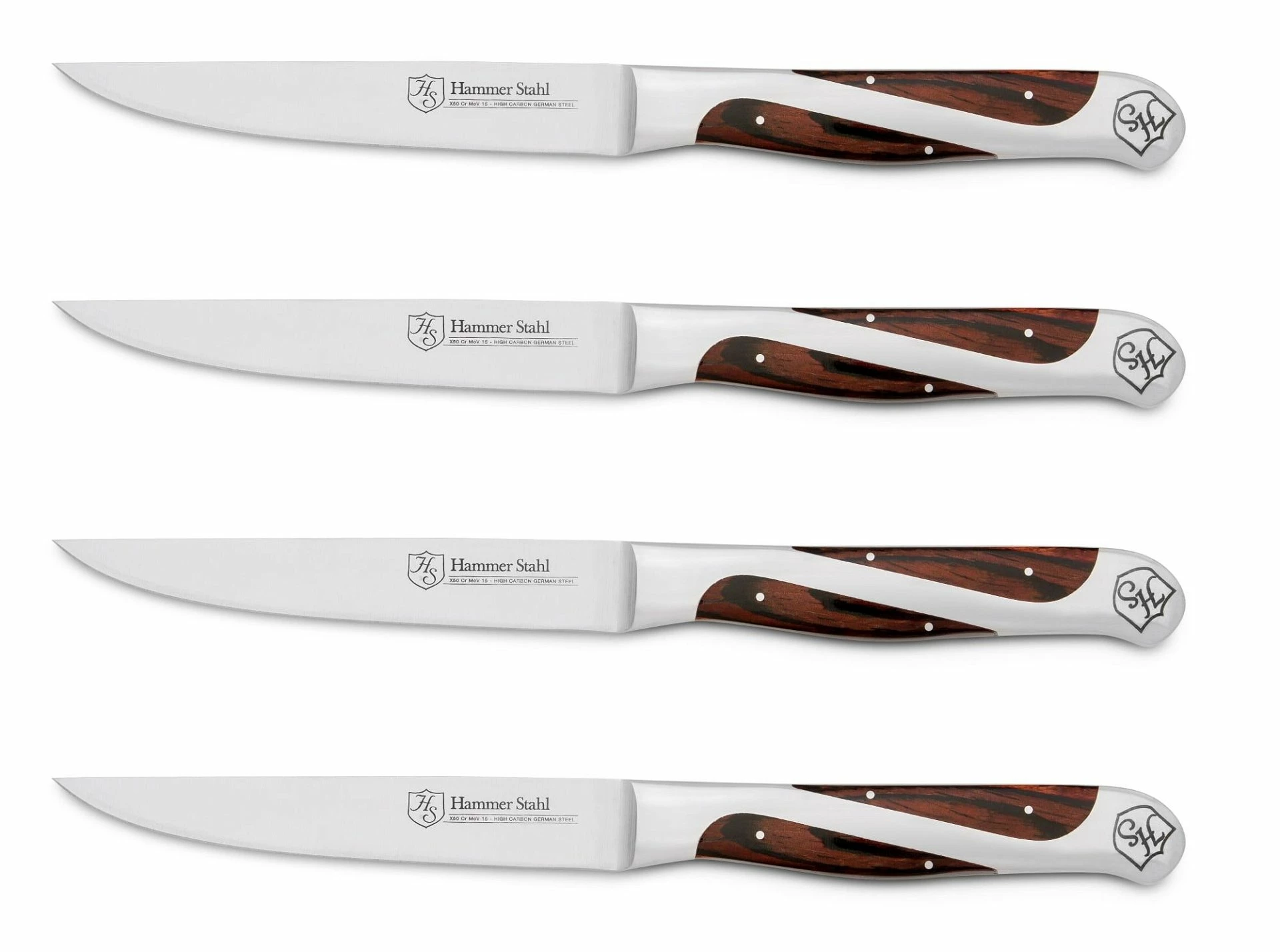 Slice into a delicious steak with ease using the 4-Piece Steak Knife Set from the Hammer Stahl Classic Collection. These beautiful straight-edged knives are sharpened to a 20° bevel for a razor-sharp edge. Just as beautiful as they are effective, each knife features a Pakkawood handle with a quad-tang design that provides better control and ergonomic grip. Arriving in a sturdy gift box with a magnetic closure, this set of 4 steak knives makes the perfect holiday gift or addition to your cutlery collection. Get these German Steel steak knives today and enjoy slicing through your next steak with renewed ease with the Hammer Stahl Classic Collection 4-Piece Steak Knife Set.Â