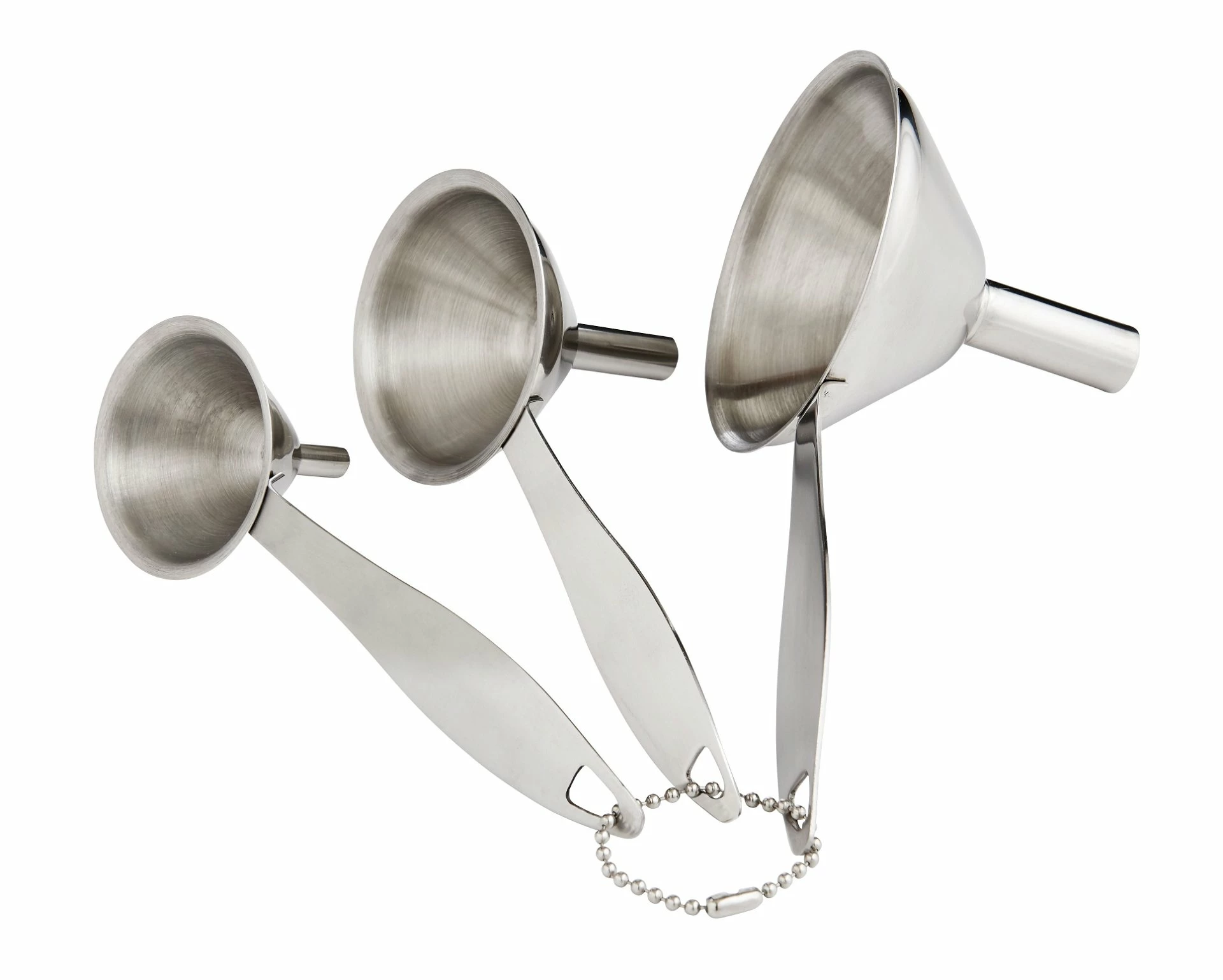 Down the hatch! Pour with strategic precision to minimize messes and keep condiments stocked with the 3-Piece Stainless Steel Condiment Funnels by Harold Imports. Stainless steel in their entirety, the condiment funnels remain durable over the years as valuable kitchen tools, those that are reliable and valuable. With the various sizes, refilling a low pepper shaker, syrup dispenser, and more is a very relaxed task, and with fewer messes at that: simply choose the right one, fit it to the container, and pour it in. Chained together, each funnel is easy to keep track of, no matter where you choose to store them all – nesting into compact form to make it so much more convenient. Vented to anticipate and prevent splashing makes the large funnel very convenient for large quantities of liquids and such, while the small and medium funnels are more for narrower openings for smaller quantities or containers of liquids and dry ingredients. Make it snappy: just funnel and pour with the Harold Imports 3-Piece Stainless Steel Condiment Funnels to refill quickly so that you can get back to eating or entertaining … and no messes at that, or fewer.