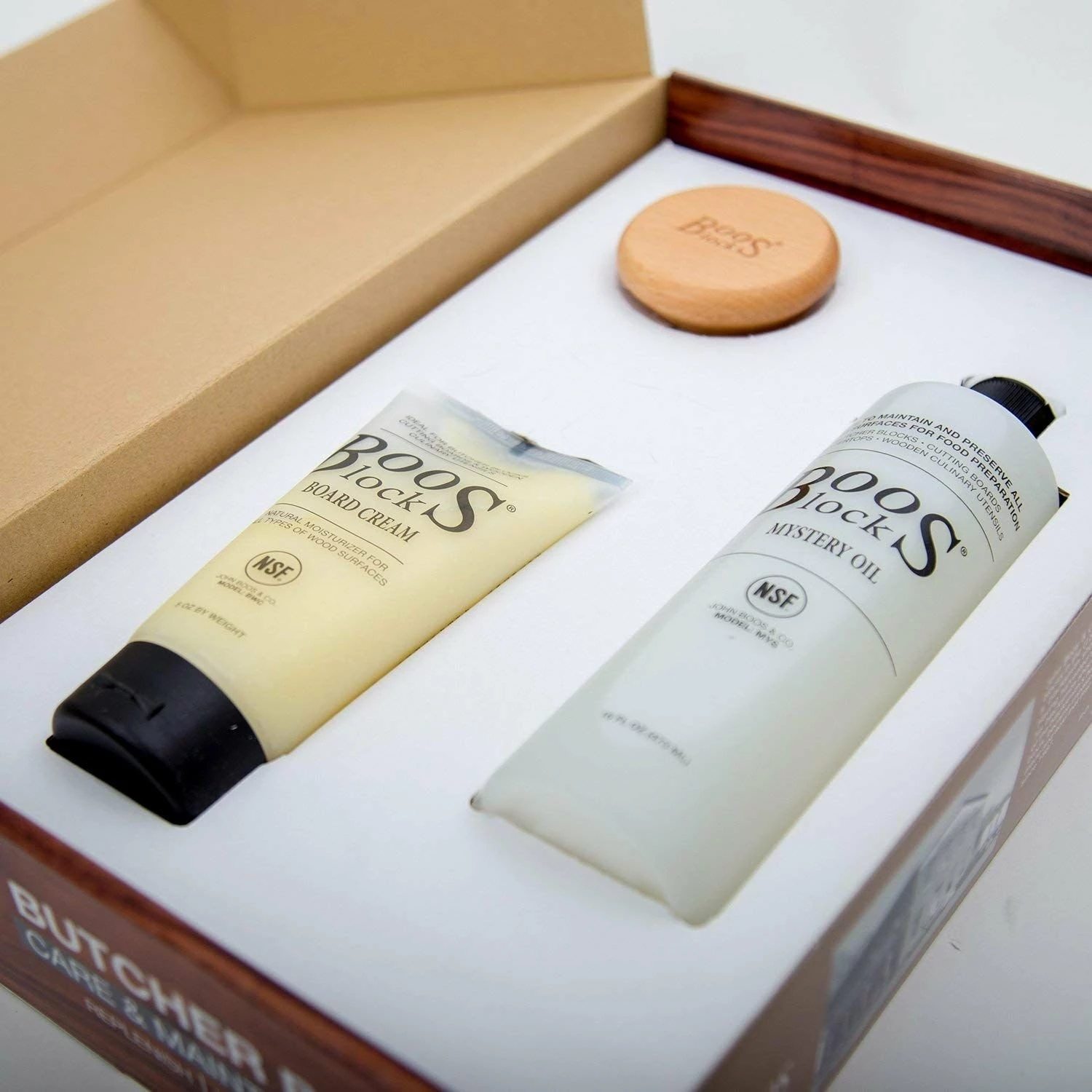 Over time, without the proper maintanence, your John Boos cutting board will suffer greatly, and you’ll want a product that lasts. This is why it is essential to have the John Boos Butcher Block 3-Piece Care & Maintenance Set! To preserve the life of your cutting board, this set includes a 16 oz. bottle of Mystery Oil, a mixture between mineral oil and beeswax, to apply a very light coat over the board, a 5 oz. tube of Board Cream to massage into the board which replenishes the moisture lost from long-term washing, and a round sponge and cover with silver ion technology that reduces the growth of bacteria. Just use the sponge to lightly scrub the oil into the board, rinse the excess, and then massage the board with the cream. Your board will look as it came originally and will prevent your board from cracking and bleaching. Increase the longevity of your cutting boards with this John Boos Butcher Block 3-Piece Care & Maintenance Kit!