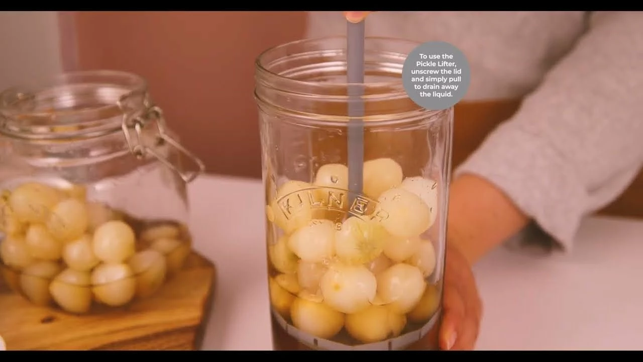 No more grabbing a fork to nab the last bit of kimchi, sauerkraut, or pickles—get yourself the Kilner 34oz Pickle Jar with Lifter! Made from glass, the Pickle Jar comes with a two-piece lid system that features a tin disc and a screw band to create that famous Kilner vacuum seal that preserves foods for longer. With a generous 34oz capacity, you may load your jar with pickled onions, cauliflower, csalamádé (Hungarian pickled mixed veggies), and so much more. Just set the lifter inside your jar, prepare your vinegar/brine with whatever you desire to pickle, let it ferment, and use the top of the lifter to pull up the contents. The base of the lifter also drains the liquid from the food, allowing you to serve and eat immediately. The jar also has embossed capacity markings on the side for easy measurements as the authentic Kilner logo is shown on the front. Now get to quick & easy pickling with the Kilner 34oz Pickle Jar with Lifter!