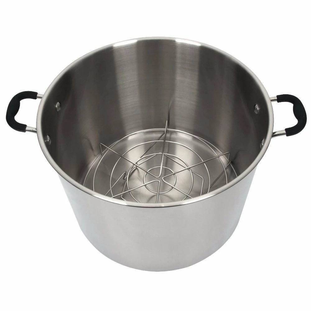 The Harvest Stainless Steel Multi-Use Canner with Glass Lid is made from stainless steel with a double-sided wire rack, allowing this canner to be used either as a steam canner or water bath canner. This steam canner/water bath canner has an indicator on the lid that tells exactly when to start processing. An added feature to this indicator knob is that it shows the different elevation zones so you can start timing your canning job correctly. The Harvest Water Bath Canning Jar comes with a glass lid and a clad bottom. The clad bottom allows for it to be used on ceramic ranges and induction ranges. The Water Bath Canning Capacity is eight – 1 pints or seven – 1 quart jars per batch.