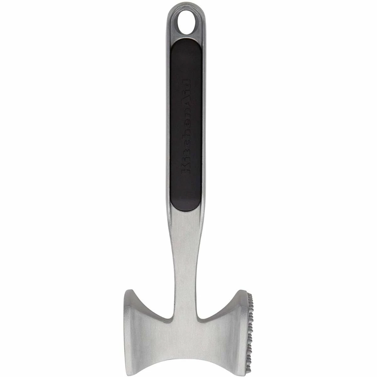 Tenderizing, flattening, crushing, the KitchenAid Universal Meat Tenderizer in black can do it all. Perfect for making a roulade, crushing fresh herbs, and tenderizing meat, this mallet is made from lightweight aluminum. This makes it easier for anyone to use and control. The mallet has two sides, the textured tenderizing side, and the smooth flattening side, which gives you more versatility in the kitchen. When it’s time to store your meat tenderizer, the handle features a hole so you can hang it to save space. Make a plethora of recipes with renewed ease, get the KitchenAid Universal Meat Tenderizer in black today!Â