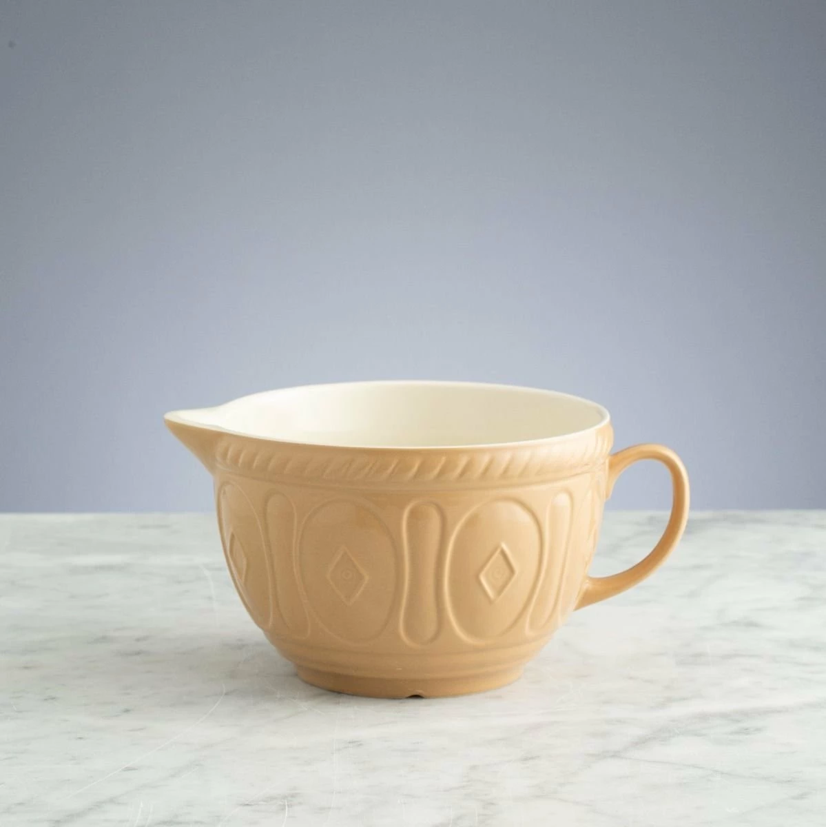 Increase the fun of making pancakes with this Mason Cash Cane Batter Bowl. Made of ceramic Earthenware and finished with a durable tan-colored glaze, this prep bowl resists chipping, cracking or fading and is safe to use in the microwave, freezer and dishwasher. Its 64-oz. capacity, sturdy handle and pouring lip are specifically designed to make this beautiful bowl ideal for mixing and pouring batters. Add a touch of whimsy to your kitchen with the Mason Cash batter bowl.Â