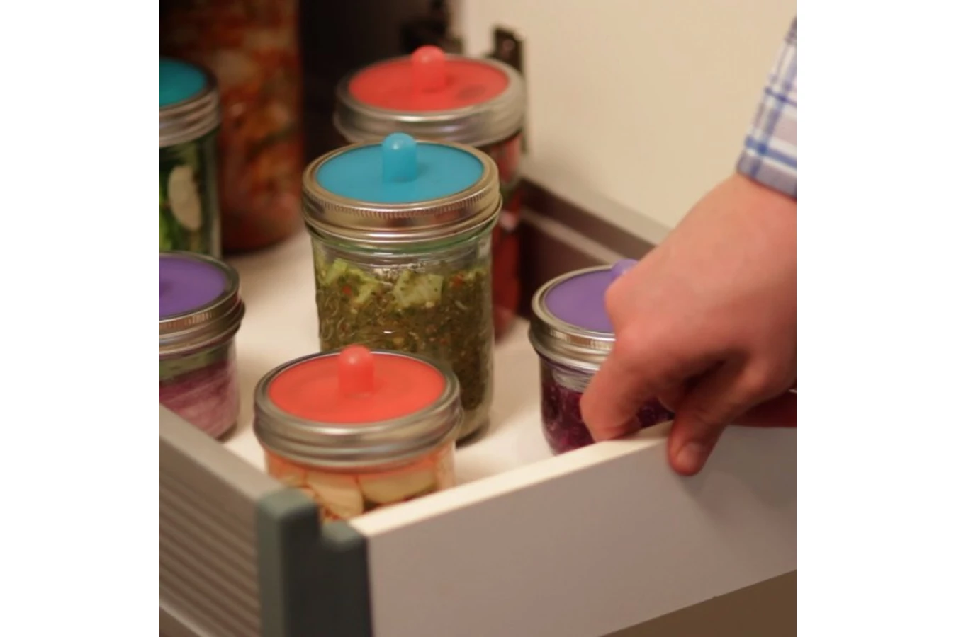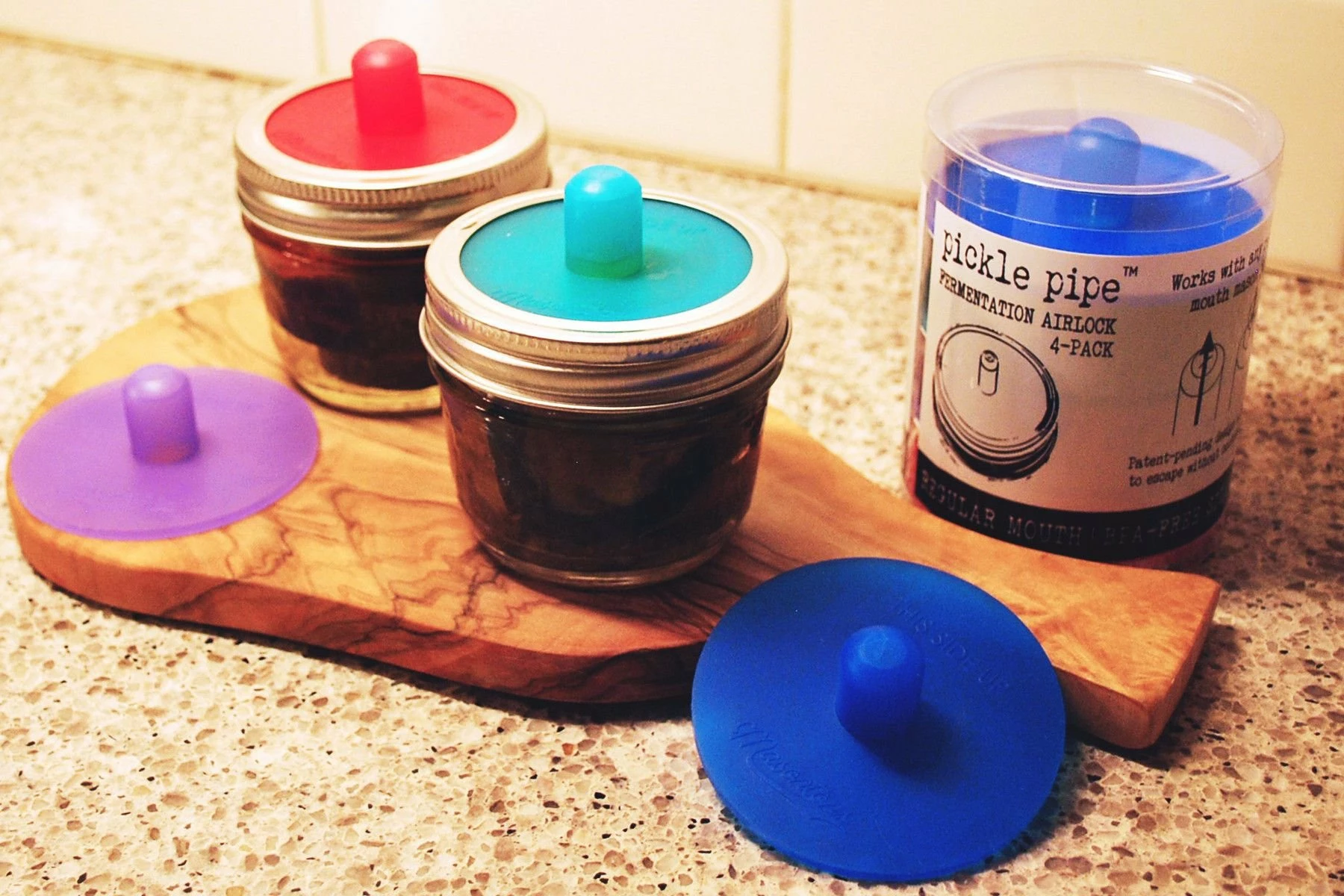 Gather fresh produce from the grocery store, farmer’s market, or from your very own garden for sauerkraut, kimchi, or pickled vegetables made possible by your new Masontops Regular Mouth Fermentation Pickle Pipes – Set of 4! This set includes 4 pickle pipes in light blue, blue, lavender, and red. The pickle pipe serves as a silicone airlock that fits onto any standard mason jar band. It is FDA food-grade approved and dishwasher safe. The pickle pipe has a specialized one-way valve in the center that only allows gas to exit the jar once enough pressure builds up inside. It will not allow oxygen or anything else to enter the jar, eliminating the risk of mold. You can leave your fermenting vegetables to sit indefinitely, so you do not have to worry about constantly checking on it. Invest in your very own Masontops Regular Mouth Fermentation Pickle Pipes and easily ferment vegetables like cabbage into sauerkraut with minimal effort!