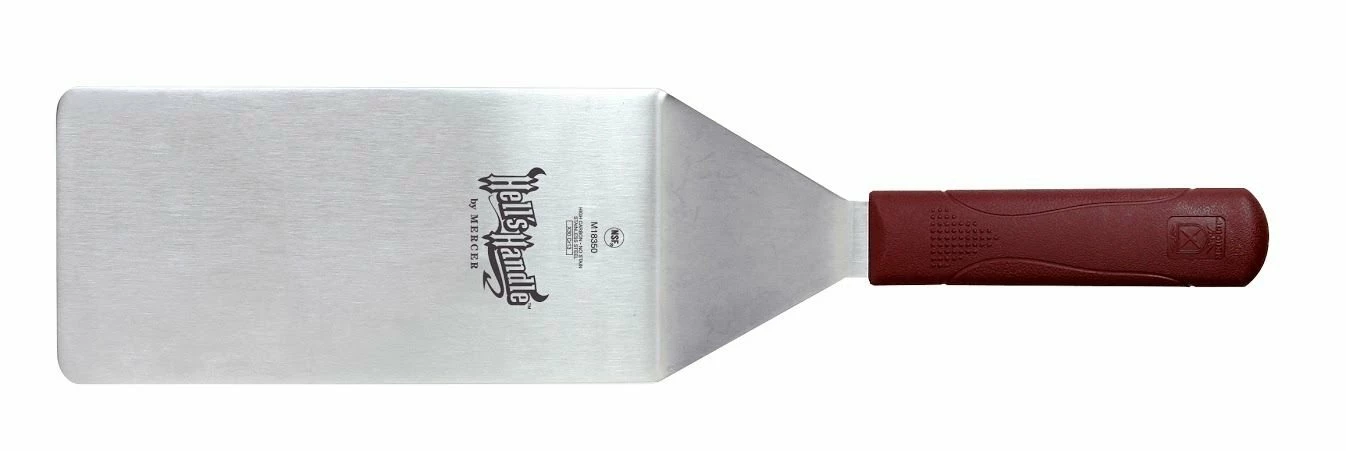 Turn those fires up and laugh at the heat! Mercer’s “Hell’s Handle” Heavy Duty Turner features a unique formulation that absorbs 50% less heat than standard polypropylene handles, remaining cooler to the touch for longer periods of time. The handles also safely withstand temperatures up to 450°F. Precision-ground stainless steel blades provide an optimum combination of flexibility and stiffness to keep your foods from falling into the flames. With an extra-long 8″ head, this turner is ideal for larger slabs of meat, such as ribs or whole chicken. Mercer’s “Hell’s Handle” Heavy Duty Turner is perfect for any grilling enthusiast who enjoys delicious smokey flavors in their meats!
