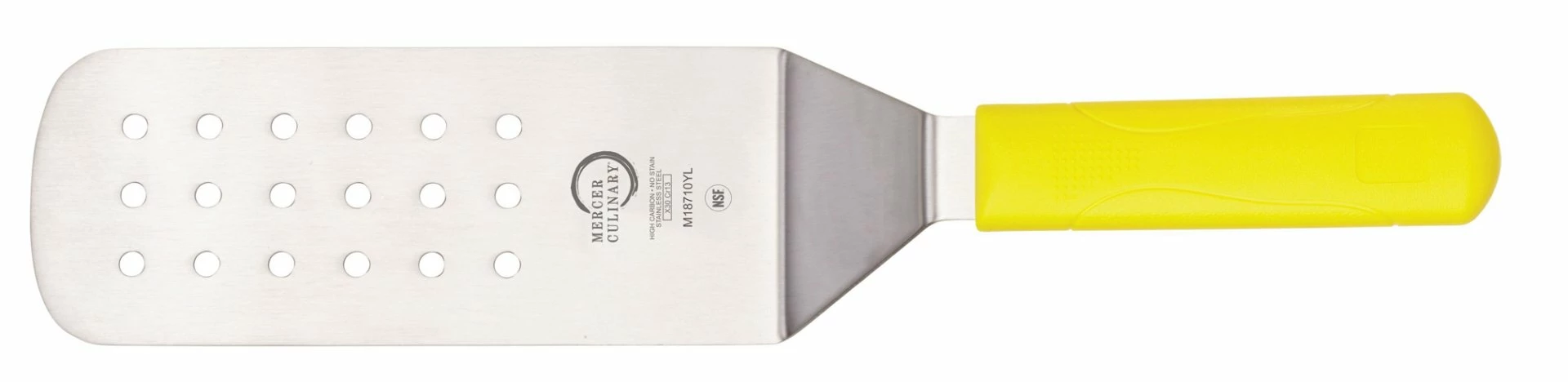 Flip large quantities of eggs, pancakes, and grilled cheese with Mercer Culinary’s Millennia Commercial Perforated Turner with a Yellow Handle. These turners are crafted with precision ground stainless steel for a mix of flexibility and stiffness while meeting the sanitation needs of a professional kitchen. The handles are designed with molded polypropylene handles for an extra-sure grip. This product features a perforated head, which is ideal for serving foods with plenty of sauce or grease. Mercer Culinary’s Millennia Commercial Perforated Turner with a Yellow Handle is perfect for professional kitchens or busy homes looking for a durable product.