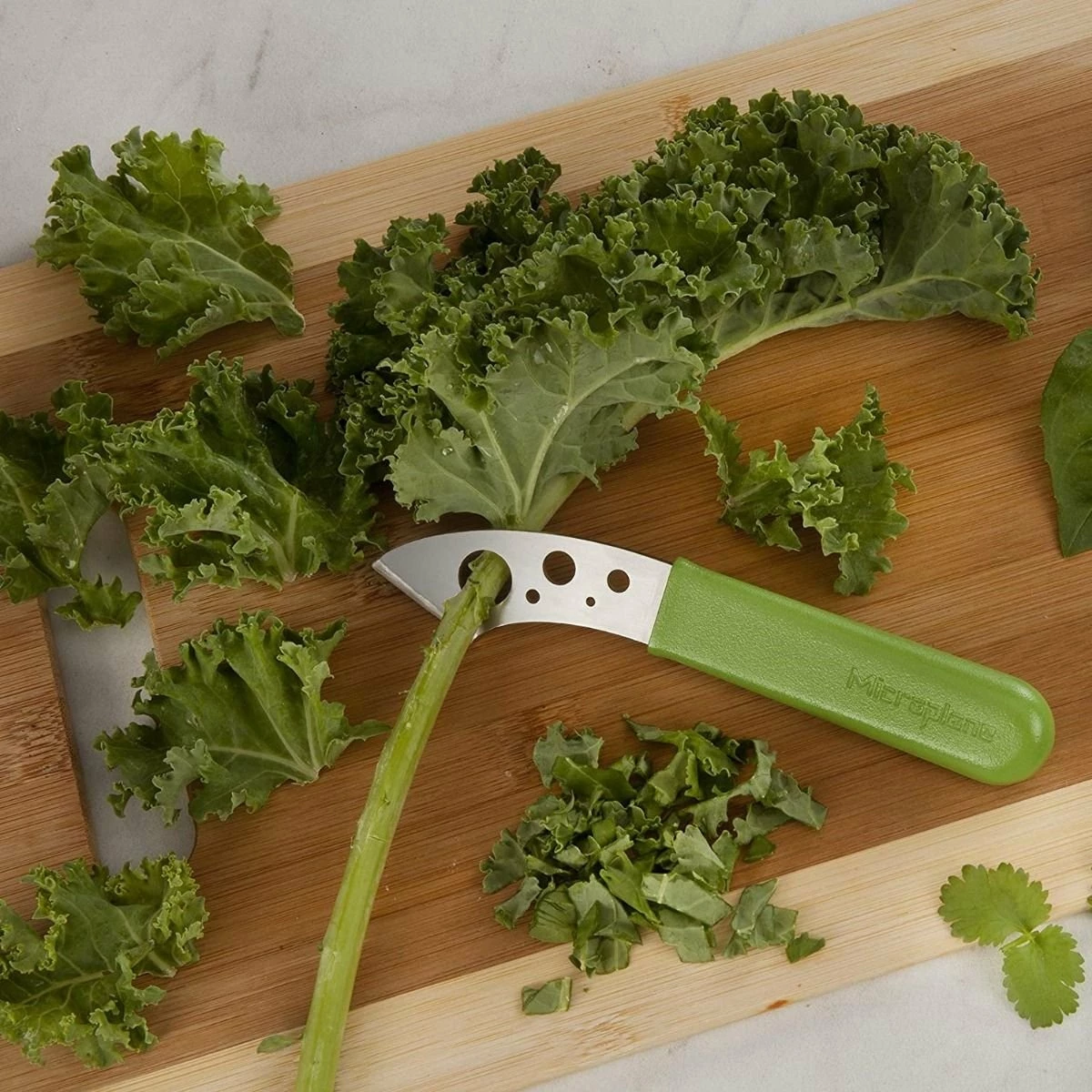 Crafted in durable stainless steel, the SwiftStrip is a uniquely curved tool that combines holes to easily strip off the leaves of herbs and leafy greens with a razor-sharp, beveled edge blade at the end for trimming stems. The SwiftStrip offers a mixture of different size holes to make it a cinch prepping all types of herbs and super food leafy greens. The tool’s largest hole is specifically sized to accommodate trendy and delicious Tuscan kale (also known as lacinato, dinosaur and palm tree kale). A mixture of different size holes makes it easy to use the SwiftStrip to prep a wide range of herbs and other types of leafy greens. The clever tool’s stainless steel body is sturdy enough to provide leverage when pulling stems from tough greens without having to worry about breakage.