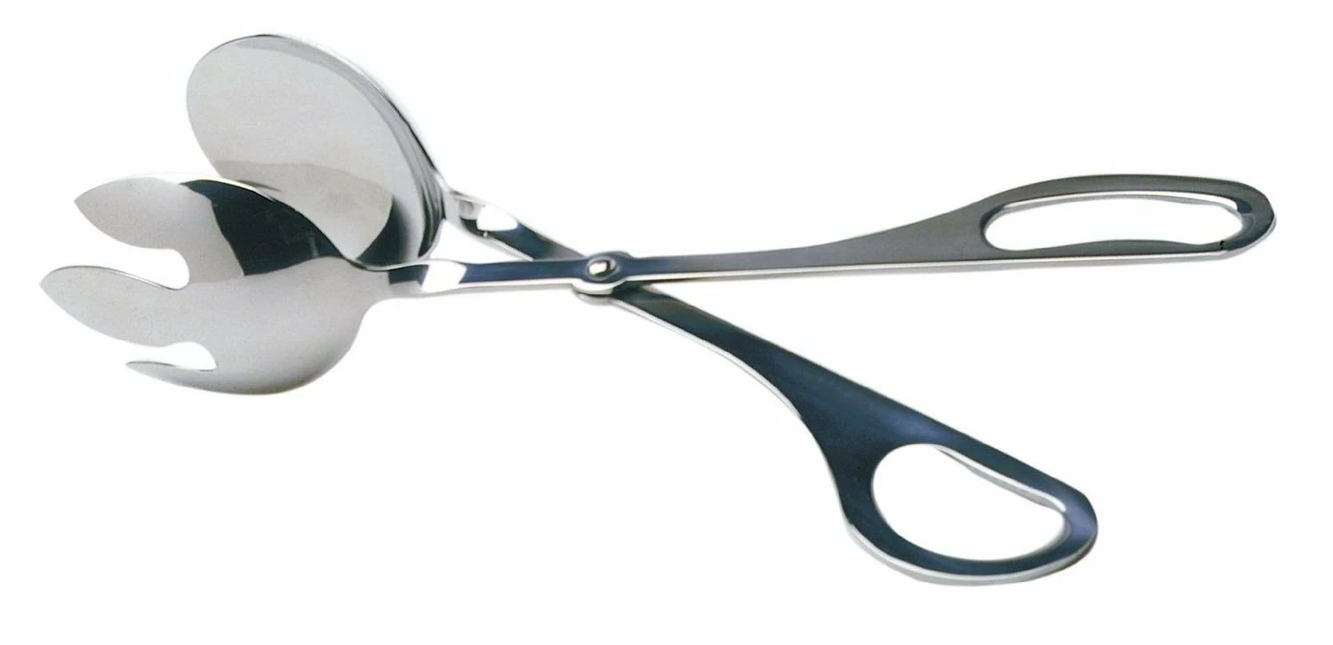 - Complementary fork and spoon clasps pick up lettuce, olives, croutons, etc.