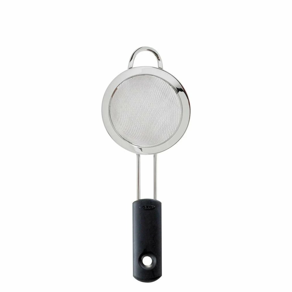 Dust sugar to put the final touch on a gingerbread house or strain tea leaves for an afternoon work intermission with the OXO mini strainer. The soft, non-slip handle gives you added confidence when dusting confections. The dishwasher safe stainless fine mesh filters leaves, pulp, or herbs and balances itself over a cup or glass. OXO delivers its promise of easy to use tools with this 3” mini strainer.