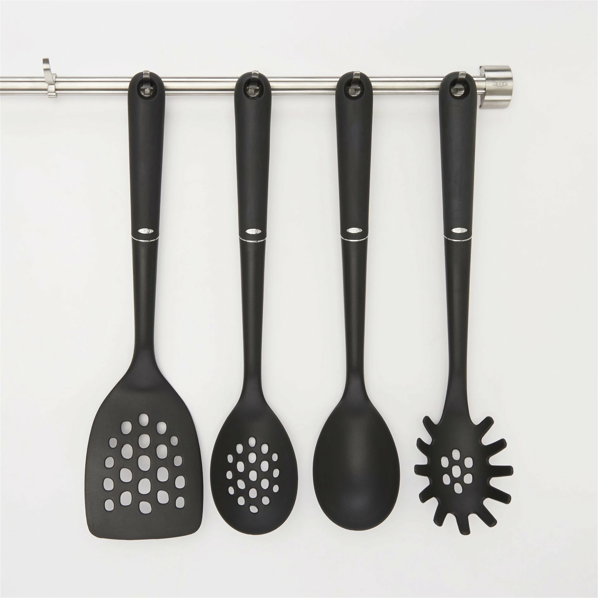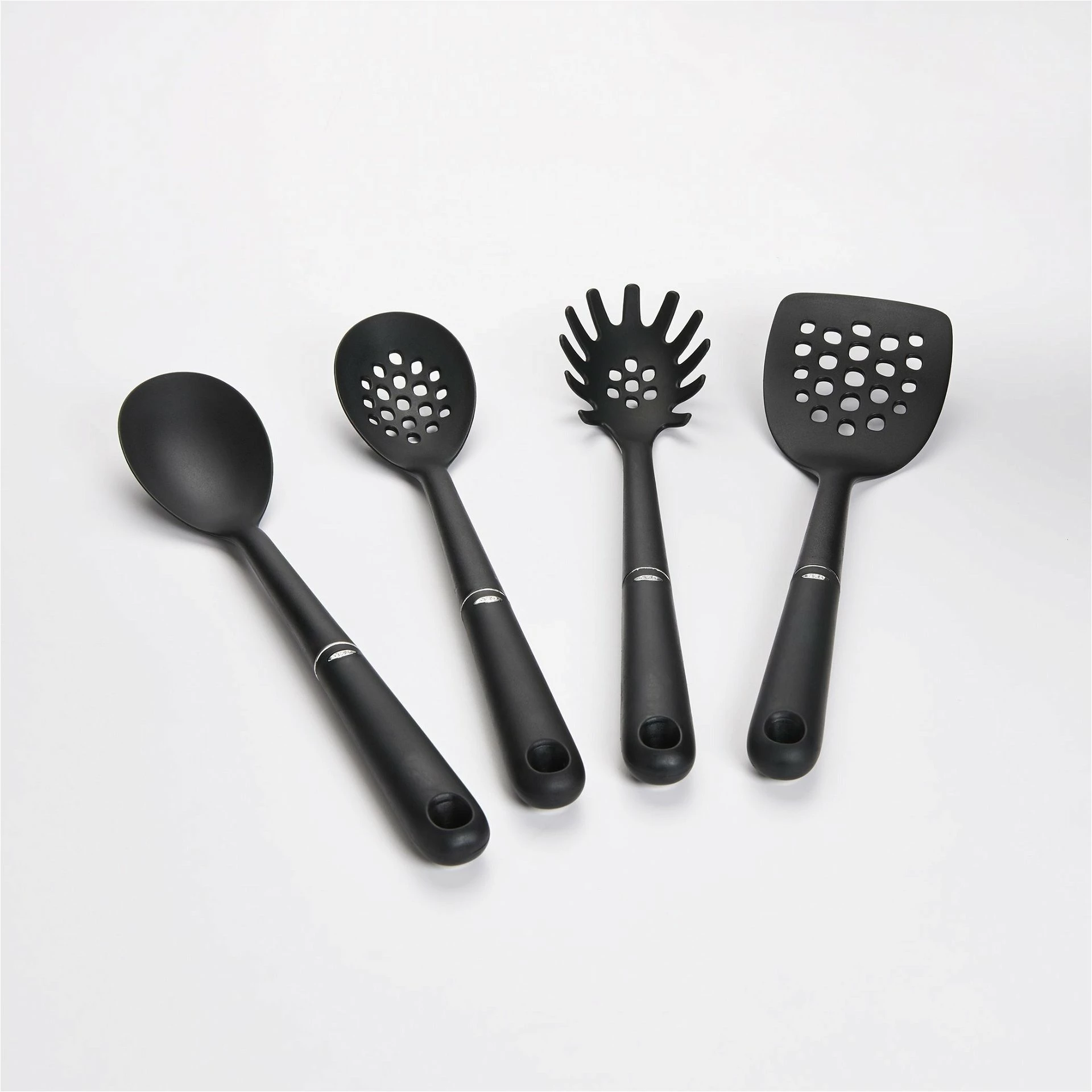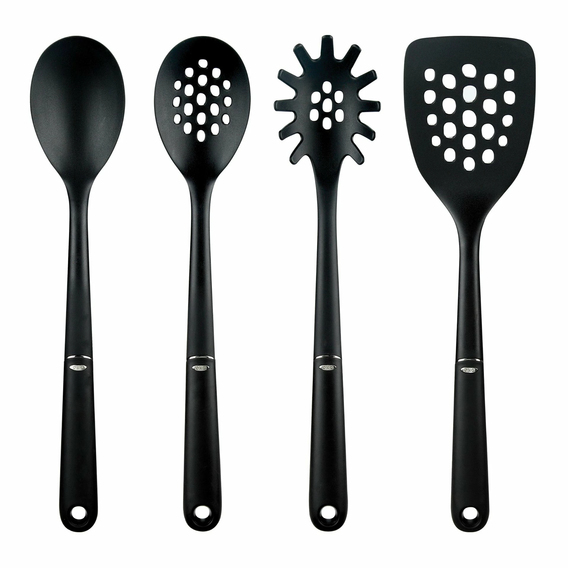 Equip your kitchen in a matching set of utensils from OXO. This 4-Piece set of nylon utensils includes a square turner, slotted spoon, serving spoon, and spaghetti server. Each tool is designed with an oversized head, making it easier to use, and a non-slip grip that makes it comfortable to handle. Made from nylon, these utensils are safe for use on non-stick cookware and are heat safe up to 400°F, which adds a great deal of versatility to them. Cook and serve any recipe you can imagine with this set of 4 nylon tools from OXO, get yours today!
