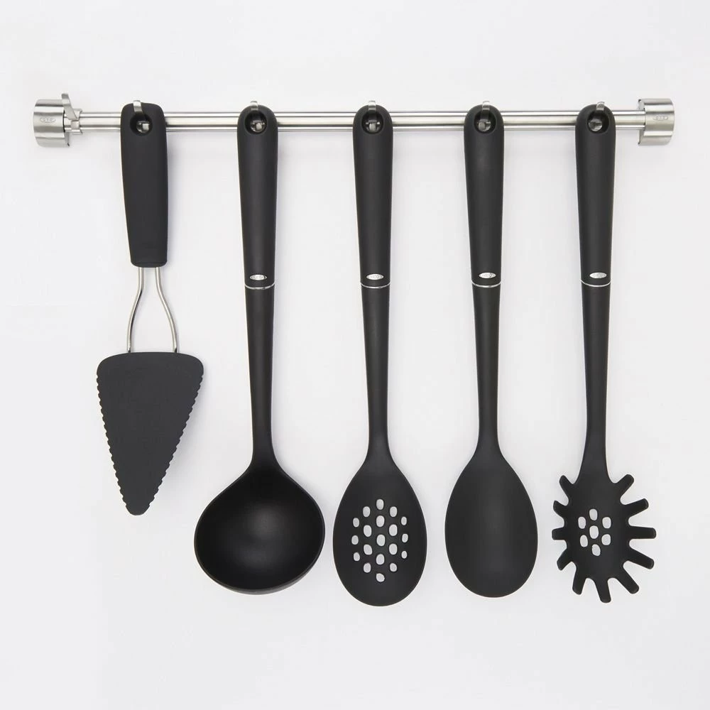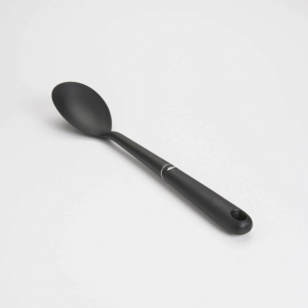 The smells that come from the kitchen should be of sizzling bacon or a simmering mushroom beef stew and not burning utensils; be confident of your tools with an OXO Good Grips nylon spoon. The OXO’s nylon construction will give you a worry free experience stirring soups, stews or sauces. The nylon is heat resistant up to 400 F is accented with stainless steel for a more contemporary look. Leave the burning risk at the door and choose a solid OXO nylon spoon for your kitchen.