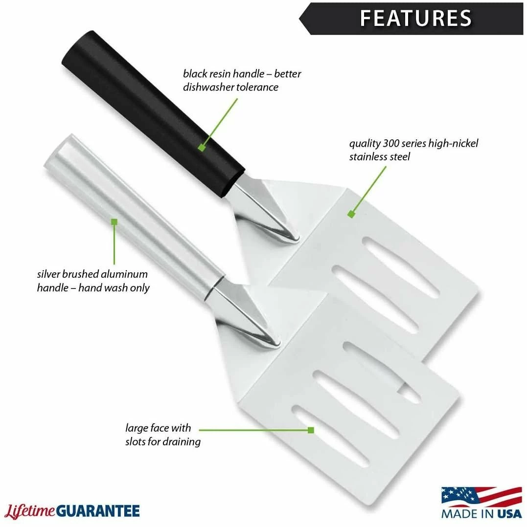 - Head constructed from 300 series high nickel stainless steel; handle constructed from silver satin cast aluminum