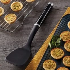 If you’re going to flip it, flip it good the first time! There are spatulas and then there are spatulas: the European Flexible Nonstick Spatula by RSVP. Thin and flexible, the black spatula wiggles its way underneath cookies, pancakes, and more to give you the support you need for that quick, easy flip. There are do-overs, but who has time for that in the morning? So, get that blueberry pancake from the pan to plate in one piece instead. Just start with your nonstick cookware to keep things from sticking, and with a safe-to-use, reliable tool like this European-style spatula, you have your breakfast or lunch done in no time. Extending out from the nylon is an 18/10 stainless steel handle equipped with a Santoprene coating, soft and comfortable to your own grip. The nylon front is resistant to temperatures up to 400°F, while the handle, on the other hand, is resistant to temperatures up to 300°F. Safe around the heat, just not on it, the handle, as well as the rest of the spatula, is rather easy to just stick in the dishwasher for quick and easy cleaning. Those little sausages with scrambled eggs are better when cooked through, so flip and scramble with the European way with the RSVP Flexible Nonstick Spatula.